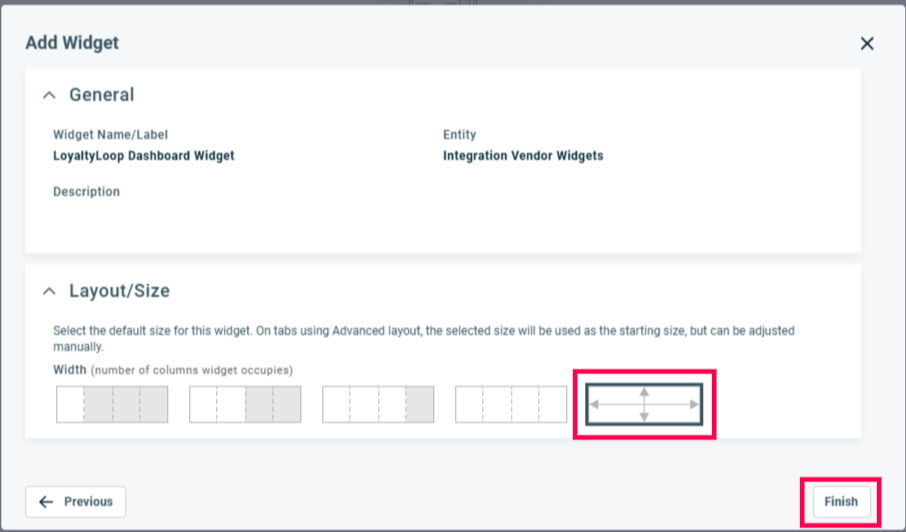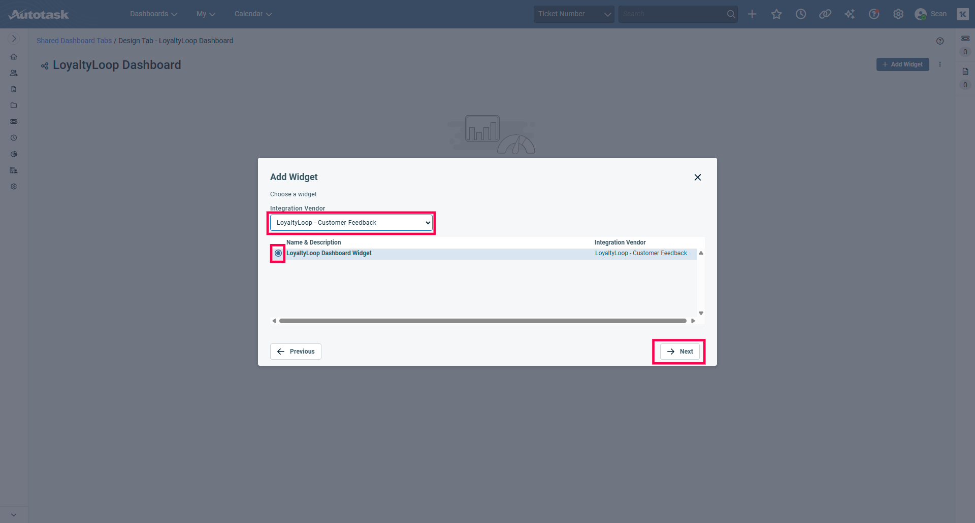 From the Integration Vendor drop down menu, select LoyaltyLoop. This will select the LoyaltyLoop Dashboard Widget. Click 'Next'.