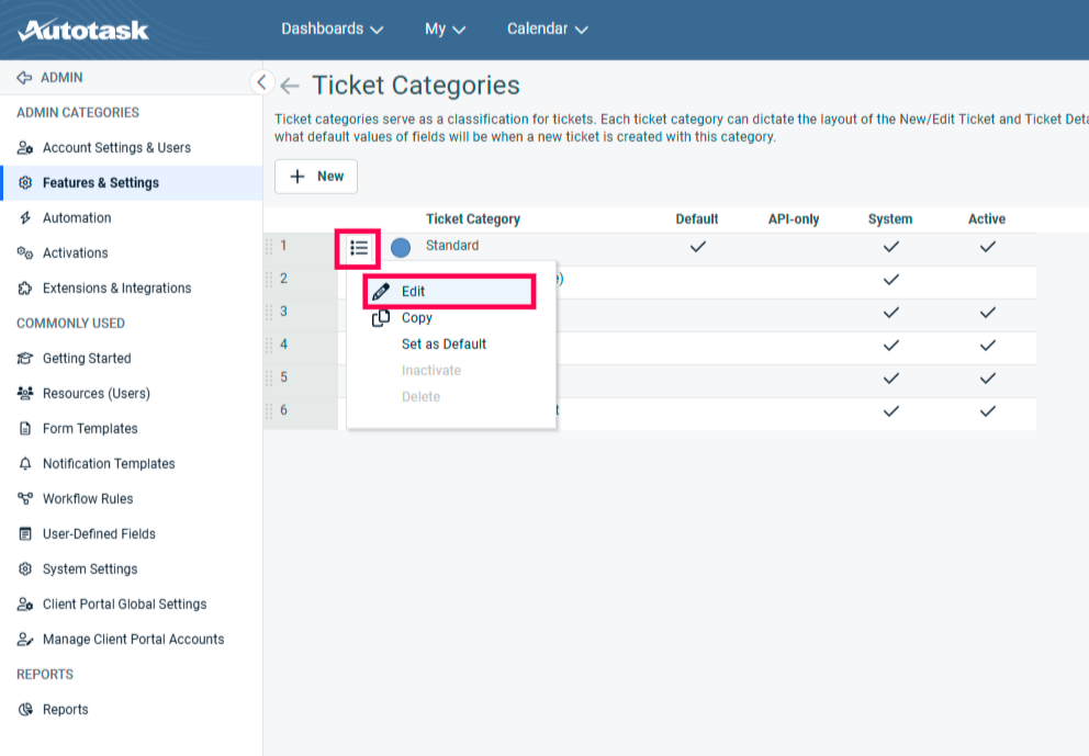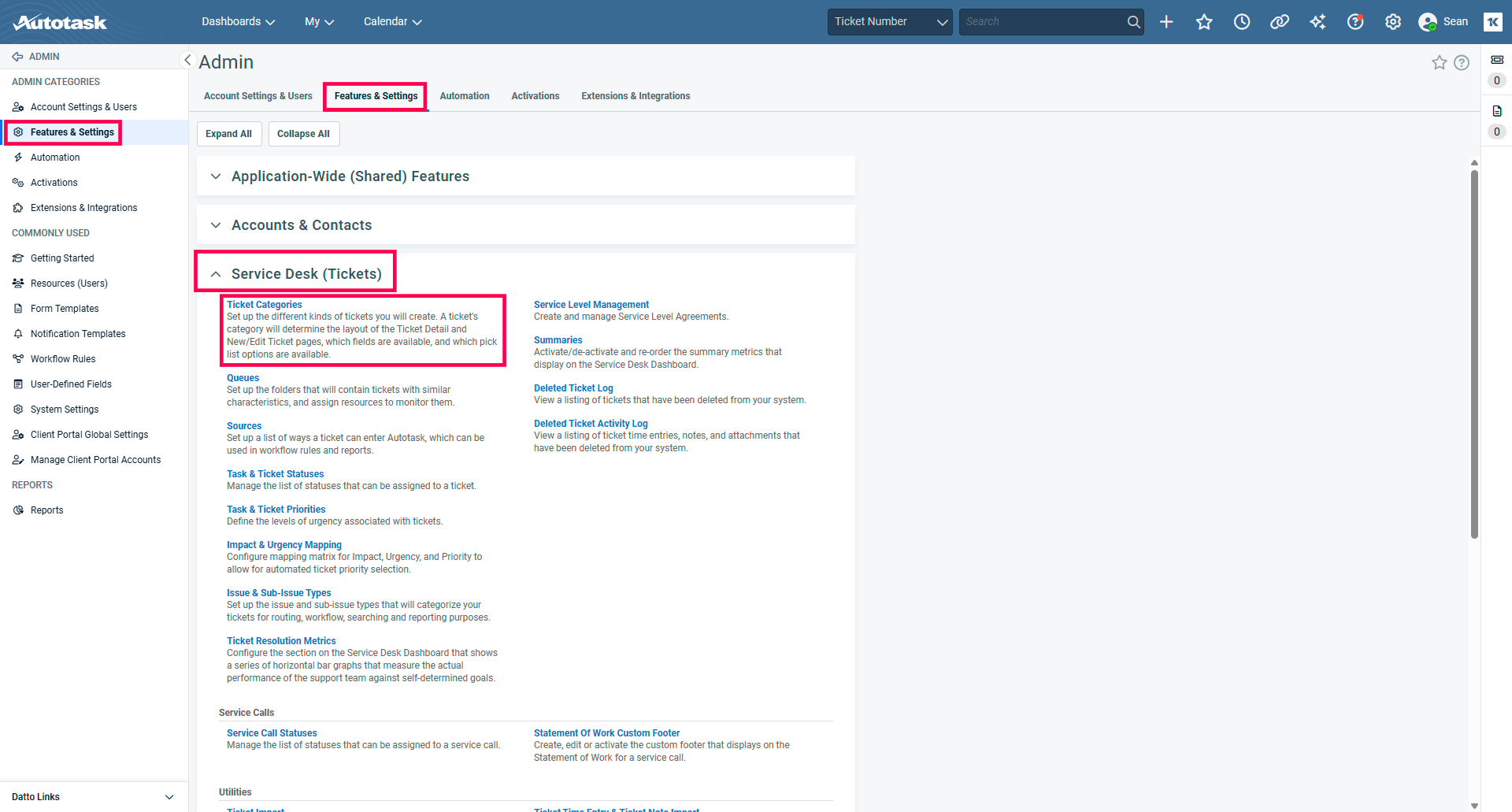 From the 'Features & Settings' menu, open the 'Service Desk (Tickets)' submenu and select 'Ticket Categories'.