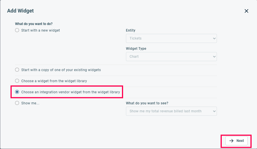 Select the 'Choose an integration vendor widget from the widget library' option and then click next.