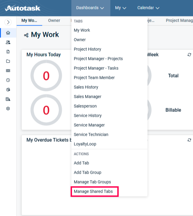 With the Widgets Enabled, from the Dashboards dropdown menu, select 'Manage Shared Tabs'
