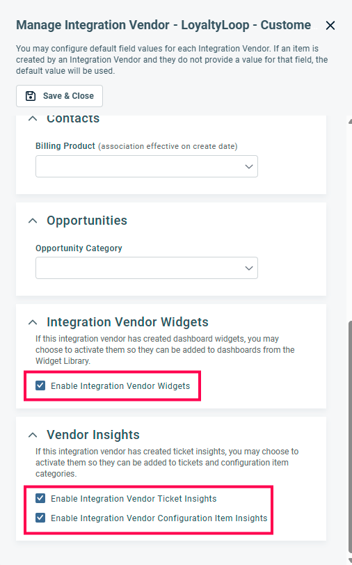 At the bottom of the menu, enable Integration Vendor Widgets and both Vendor Insights. Once complete, Save & Close.