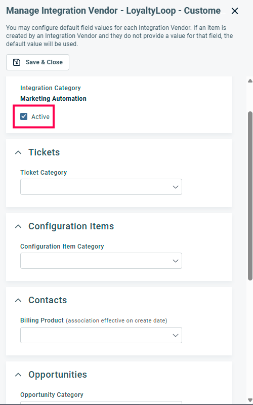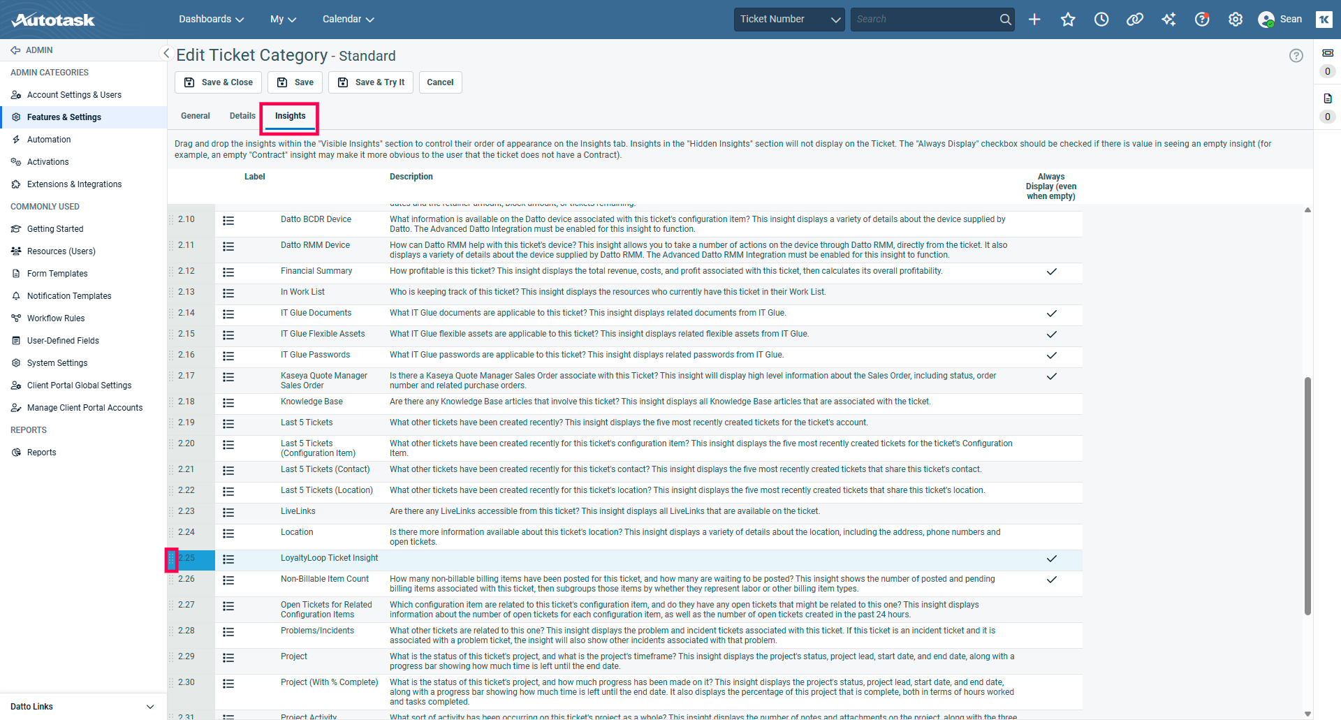 With LoyaltyLoop Ticket Insight listed as a Visible Insight, click 'Save & Close'. Repeat these steps as necessary for other relevant ticket categories.