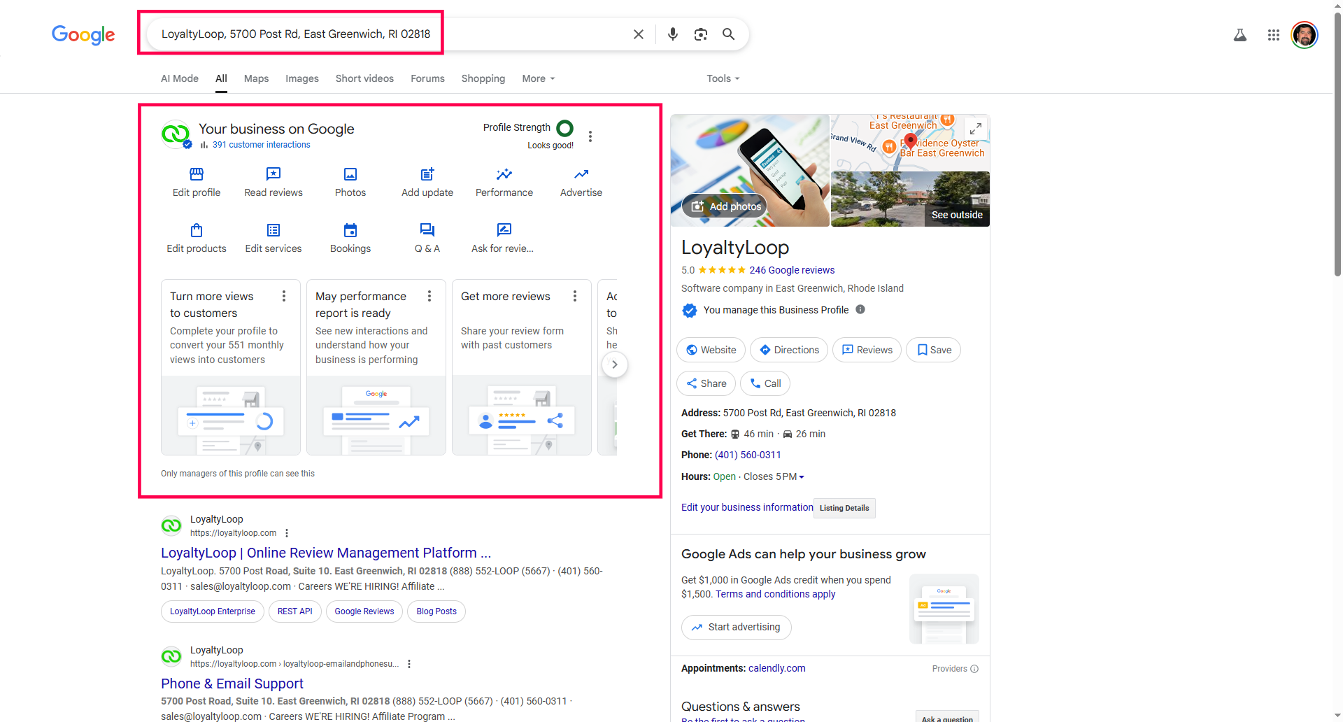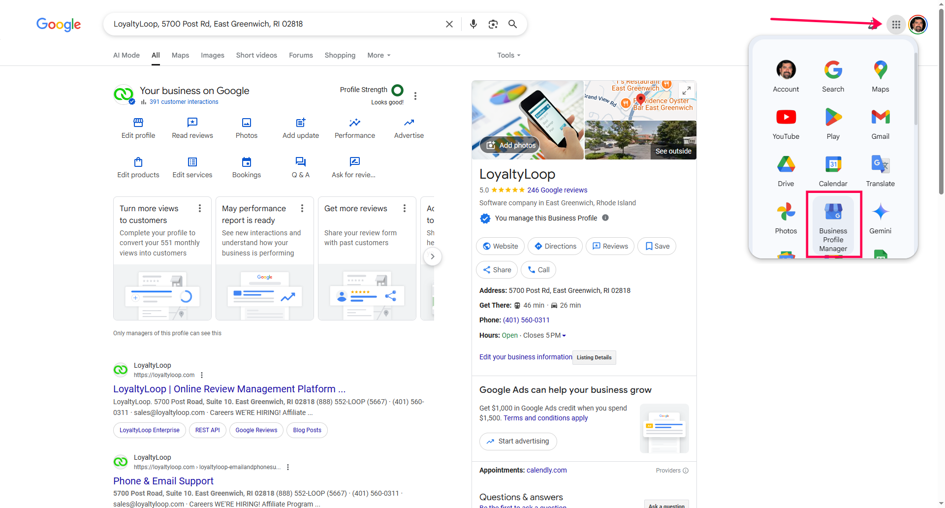 The simplest way to do this, is to go to Google and sign in using the Google account (email address) you believe your company uses to manage your GBP. Then, search Google for your company using your company name and address. If the top of the Google search results page shows "Your business on Google", like shown below, then you have identified the correct Google account to use inside LoyaltyLoop. If not, try signing in with other Google accounts your business uses to manage your GBP, and repeat the search. You can also click the 9-block icon near your username, and look for the "Business Profile Manager" icon.