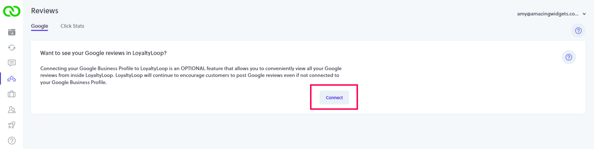 Click the Reviews tab from the left main menu, and then click the Connect button. You’ll then be asked to authenticate to your Google Business Profile using the Google account that your company uses to manage this location's Google Business Profile (i.e. Step 1 above). You can also connect by going to your Settings, then Review Site, then clicking Connect next to your Google page. Once authenticated, LoyaltyLoop will automatically match all your Google Business Profiles associated with that Google account with the correct location in LoyaltyLoop if it exists.