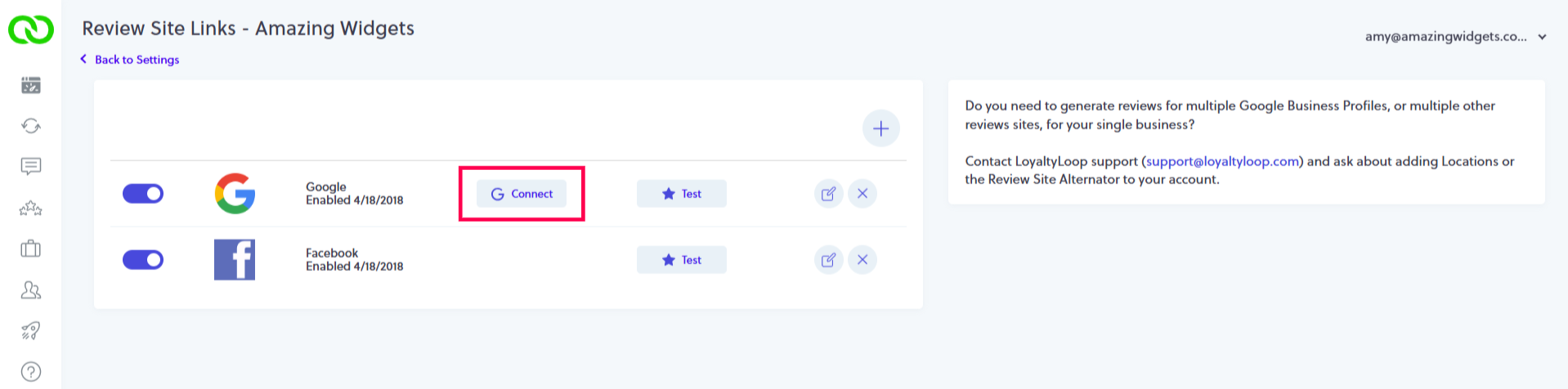 If you use more than one Google account to manage multiple Google Business Profiles for your locations, you can connect another Profile by going to Settings and click Review Sites for the other location. Then click Connect, and sign-in with your other Google account and LoyaltyLoop will once again automatically match any Google Business Profiles associated with that account, with your LoyaltyLoop locations if they exist.