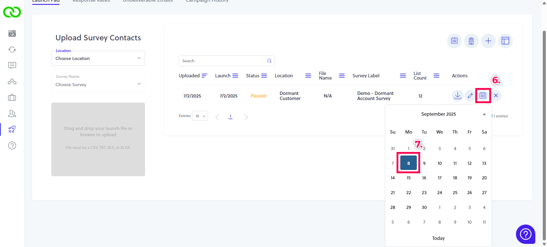 To schedule your campaign launch, (6) click the calendar icon and (7) select the date you want your customers to receive their survey invitation.