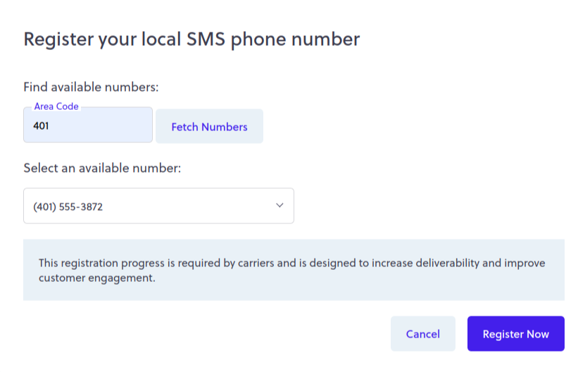 Choose a phone number from which your text messages will be sent. Consider choosing an area code that matches your company phone number. Once you've chosen a number, click “Register Now”.