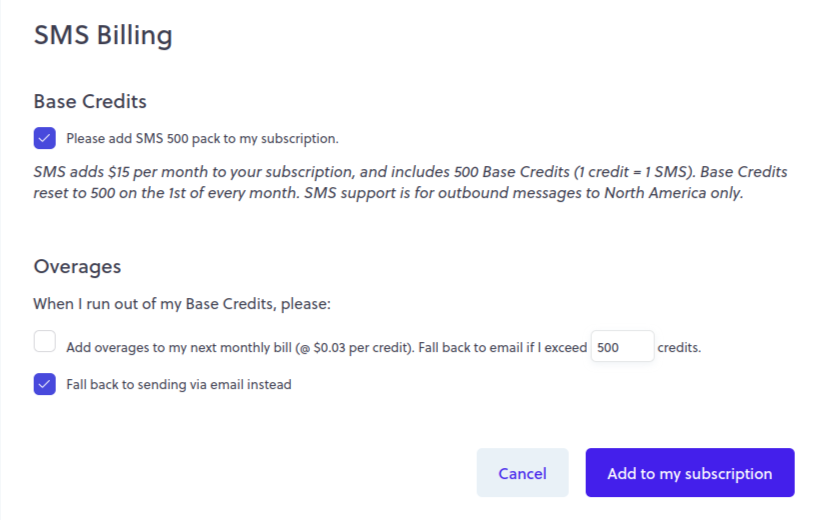 Choose how LoyaltyLoop should handle any SMS Overages. Then click the button “Add to my subscription”.
