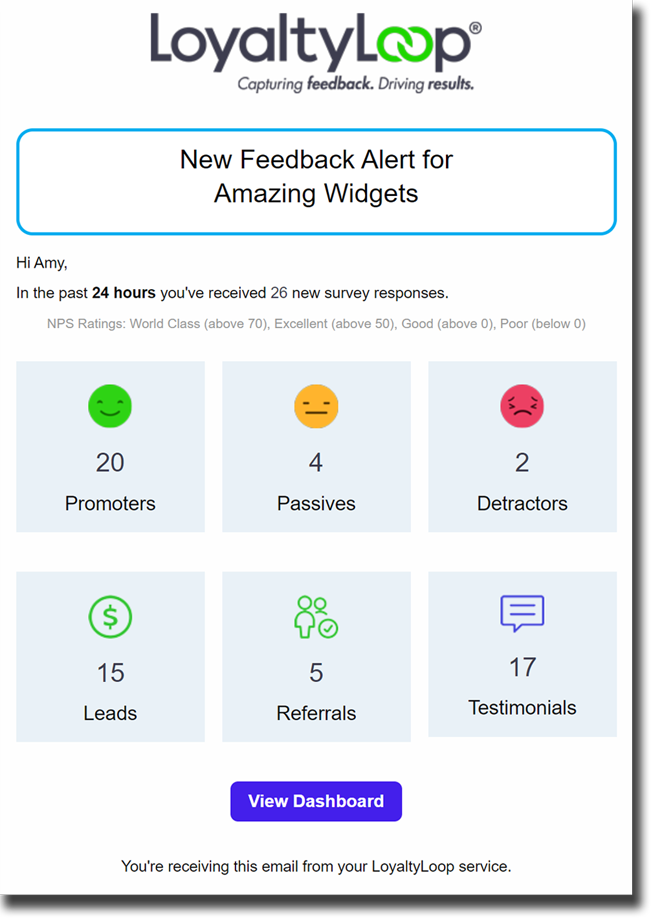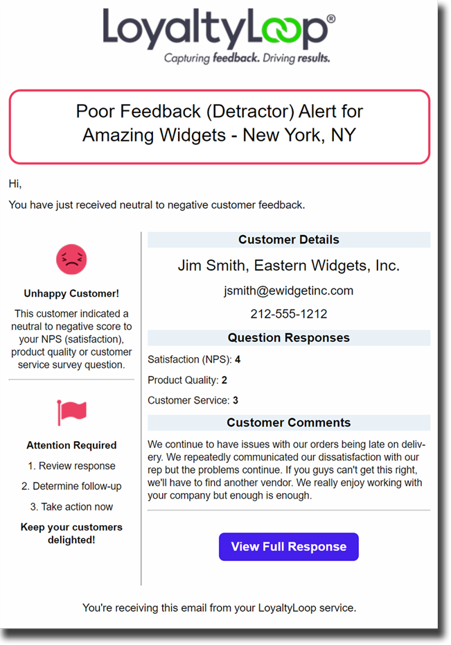 Poor Feedback Alerts trigger based on Detractor responses (i.e. "Not Sure", "Unlikely", or Very Unlikely" or 0-6) to your Net Promoter Score question. However, you can configure this alert to trigger on your other Customer Experience (CX) questions ...