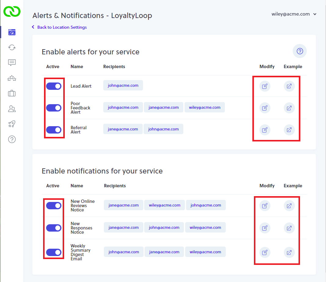 There are several email alerts generated by LoyaltyLoop to keep you, and your team, informed and in position to respond to the various feedback coming from your customers. To view and set your alerts, follow these steps.