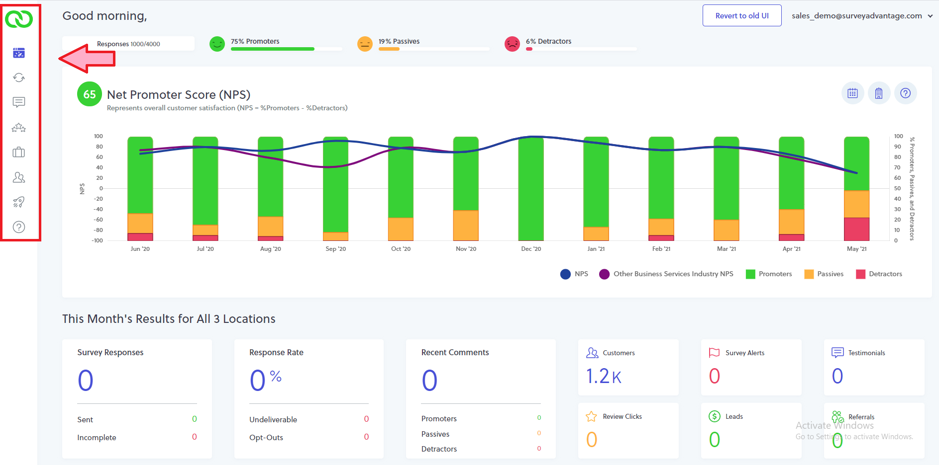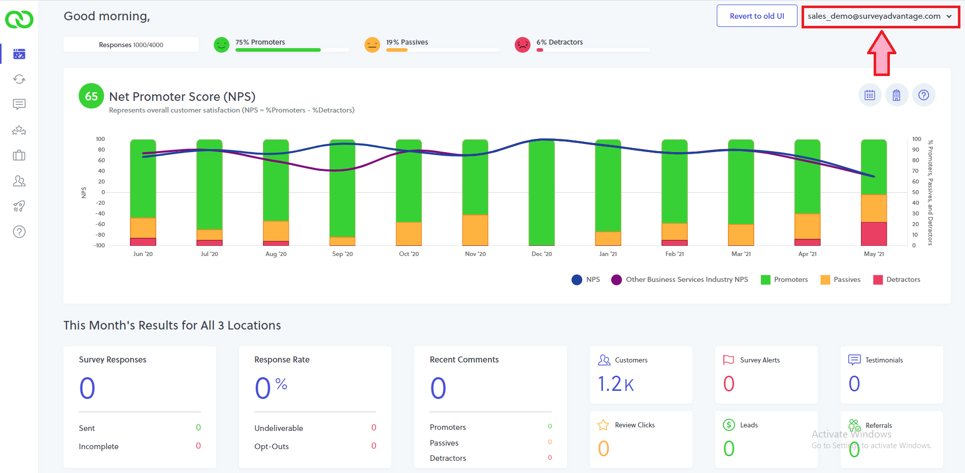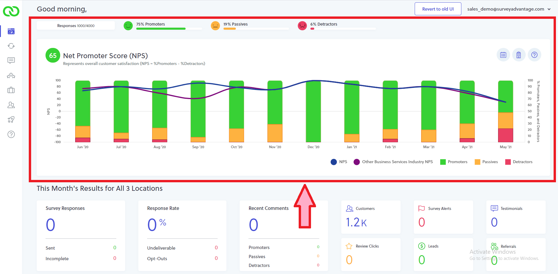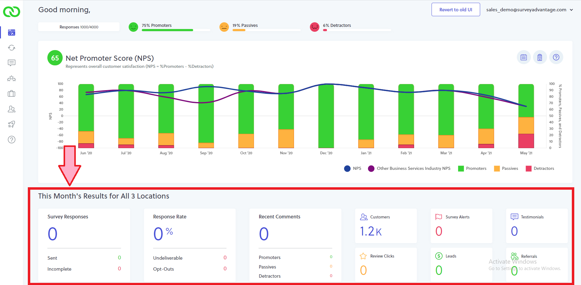 - Results Widgets: By default, this panel of widgets displays all launch results for the current month. This section helps you to keep tabs on your response rate, review clicks, leads, poor survey responses and other useful data. Much of this data can also be found within your email alerts (i.e. weekly summary digest and new response emails). By clicking on any widget, you’ll be directed to that specific section of LoyaltyLoop.