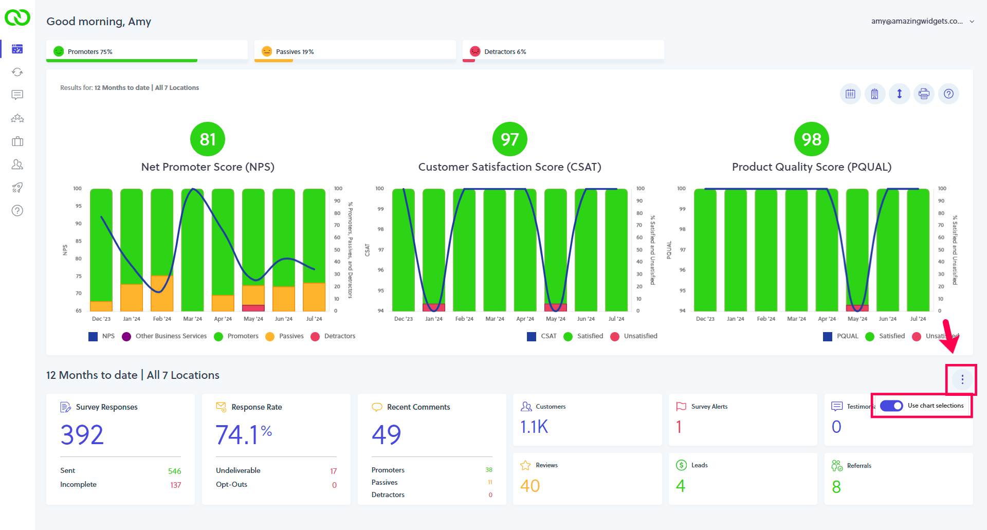 - Results Widgets Using Chart Selections: Users have the ability to update the chart to provide results based on the chart selection's date range and (for multi-location users) the locations selected. Click the (⋮) icon and toggle the switch to "Use chart selections". Your dashboard will save this setting for future sessions.