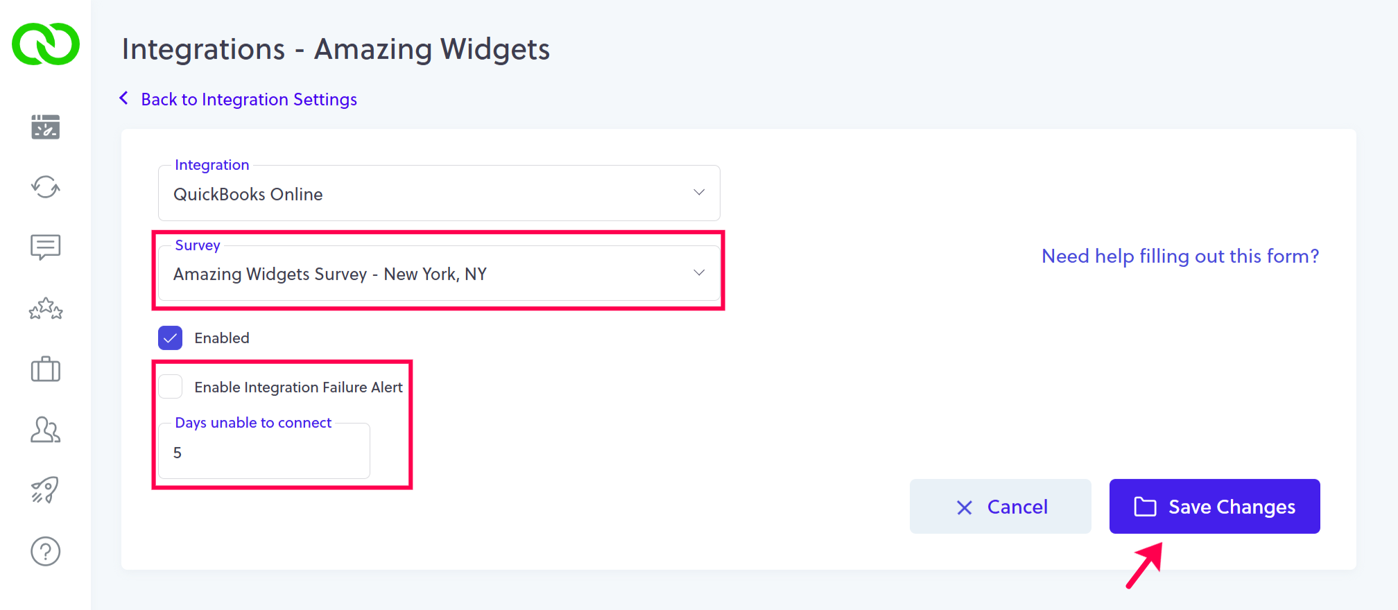9. Confirm When QuickBooks successfully connects with your LoyaltyLoop, you will land on the integration configuration form for QuickBooks Online back inside your LoyaltyLoop account. If you have more than one LoyaltyLoop survey, choose the survey that should use your QBO integration data, make sure it is "Enabled", and optionally, turn on the integration failure alert to notify you if the integration fails to run. Finally, click Save Changes, and you're done!