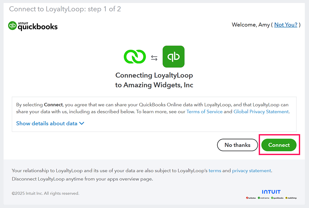 - QuickBooks will challenge you to enter your username and password you use to access Quickbooks Online. Follow any other instructions from QuickBooks on these screens. If you have multiple businesses, choose the business you wish to connect to LoyaltyLoop. On the QBO connection page, click the "Connect" button.