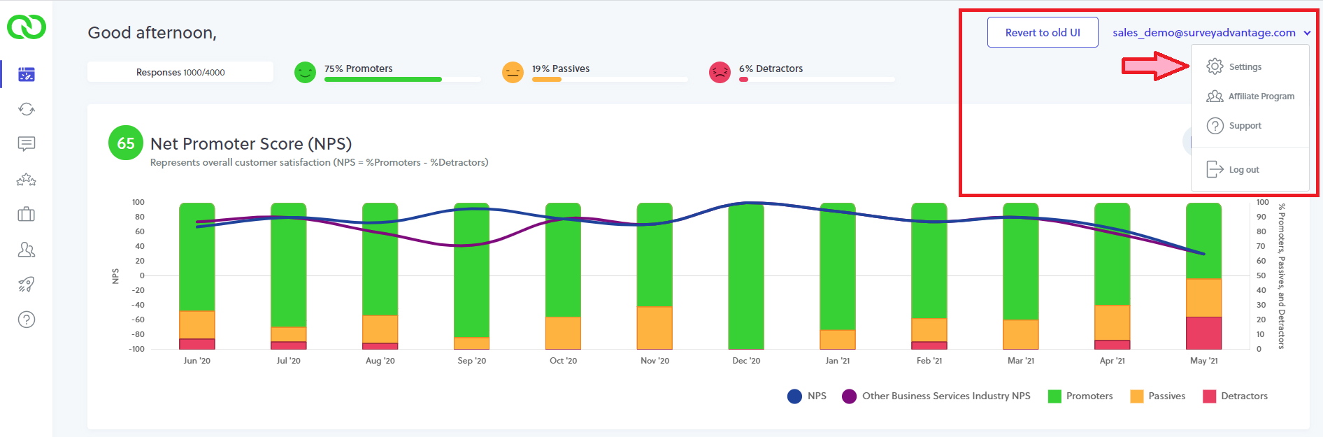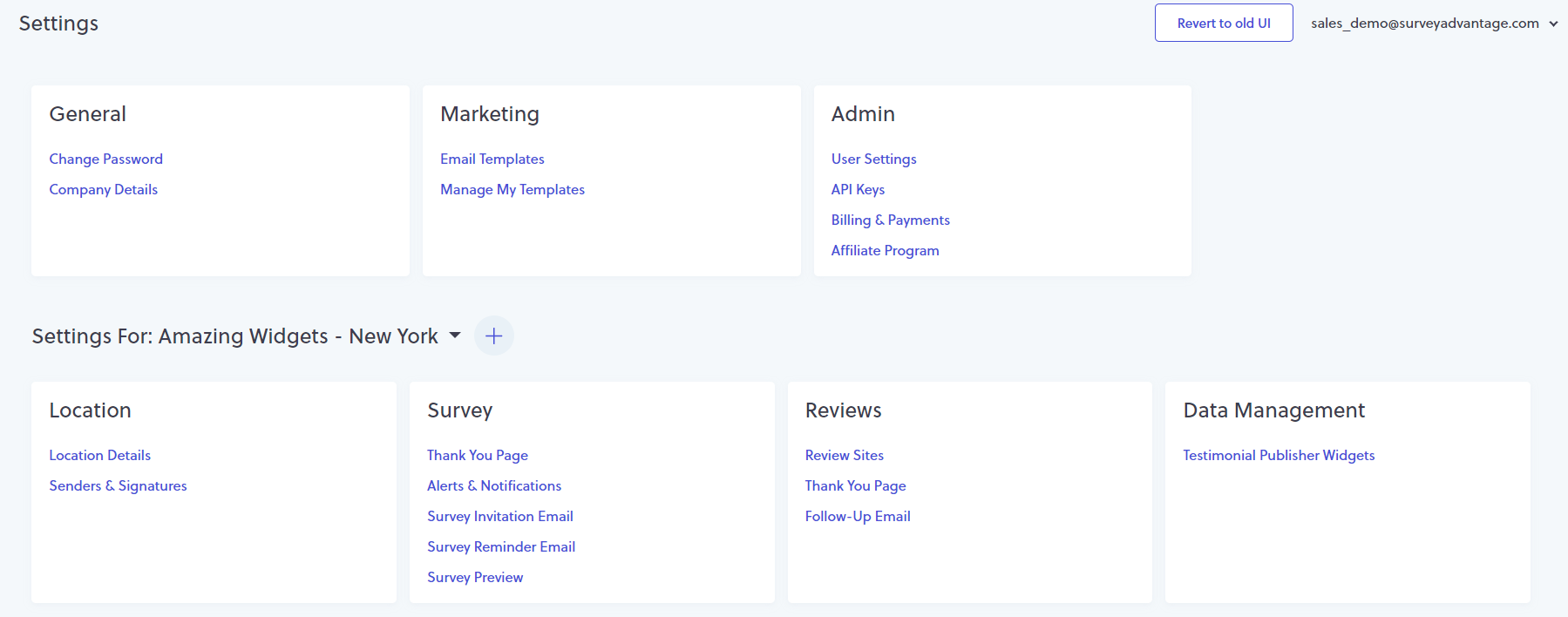 The Settings page provides access to various details about your service configuration, including your personal details, your company details, your signature file used in your survey invitation emails and other follow-up emails, your survey invitation and follow-up emails, ‘thank you’ pages, review sites, and more. Go ahead and explore your Settings pages.