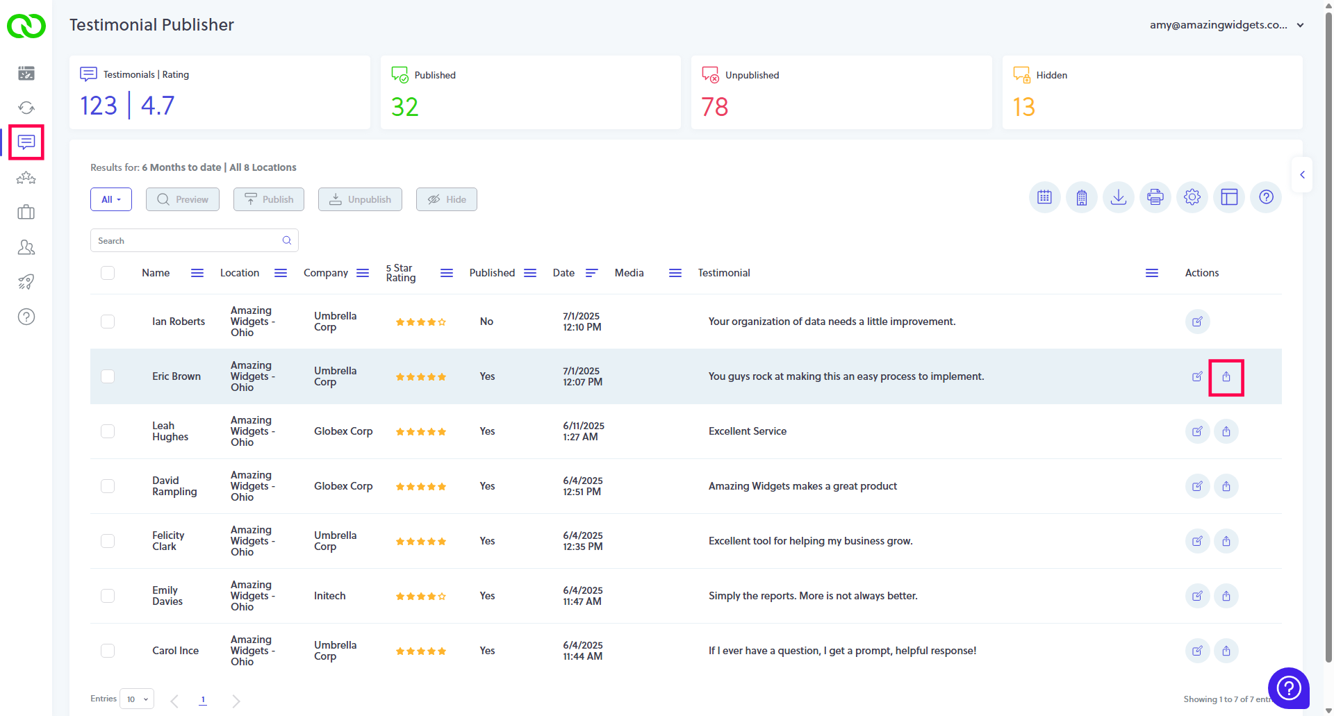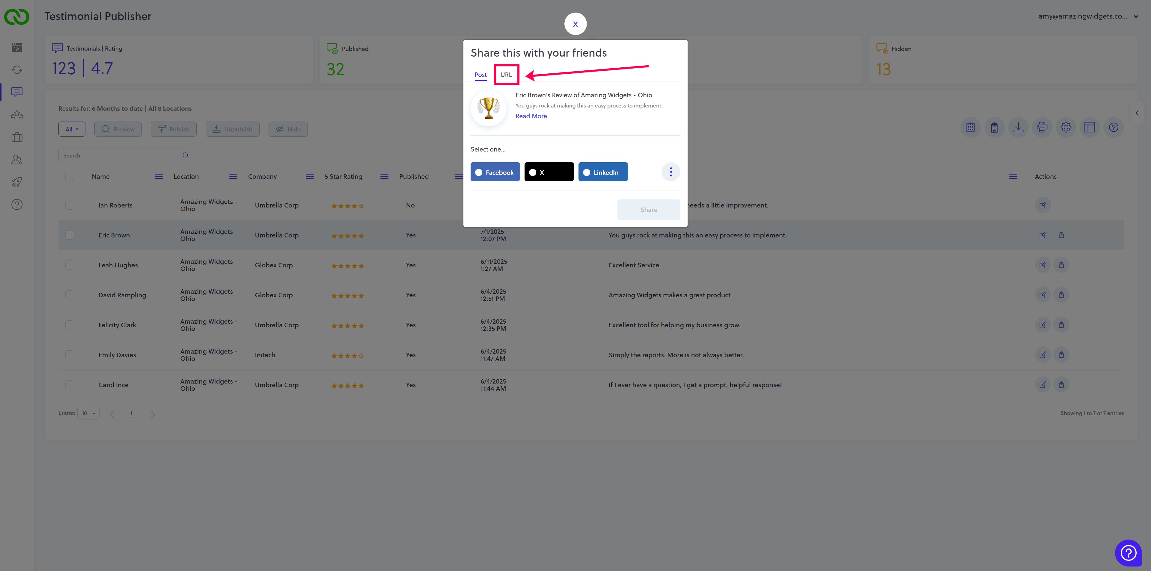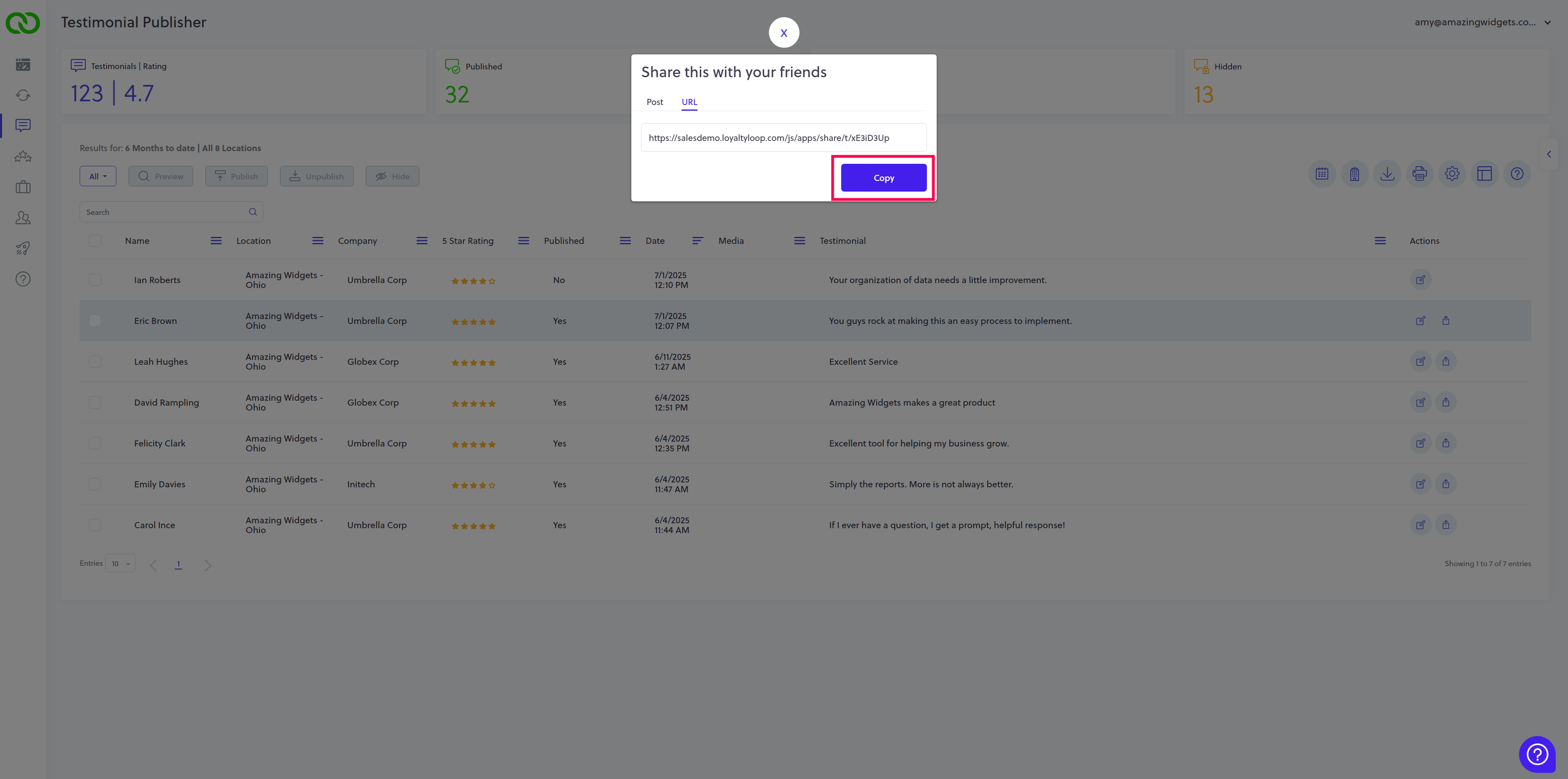 1. From your LoyaltyLoop Testimonial Publisher, select the share action button.