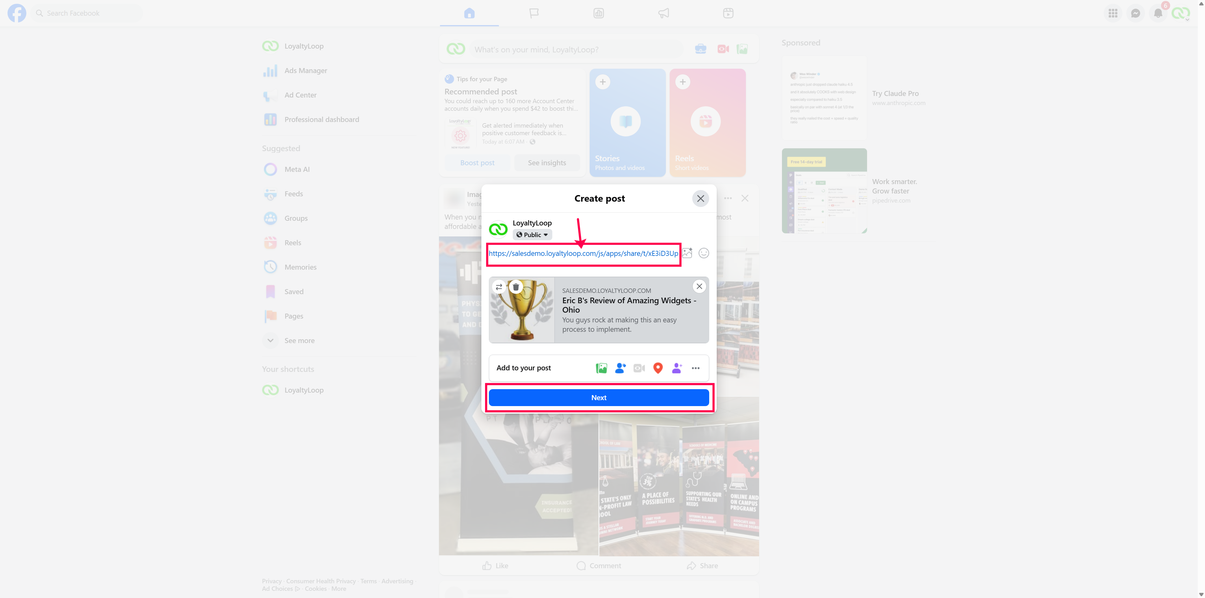 5. Paste your link into your post, along with any additional content. Then click next and Post!